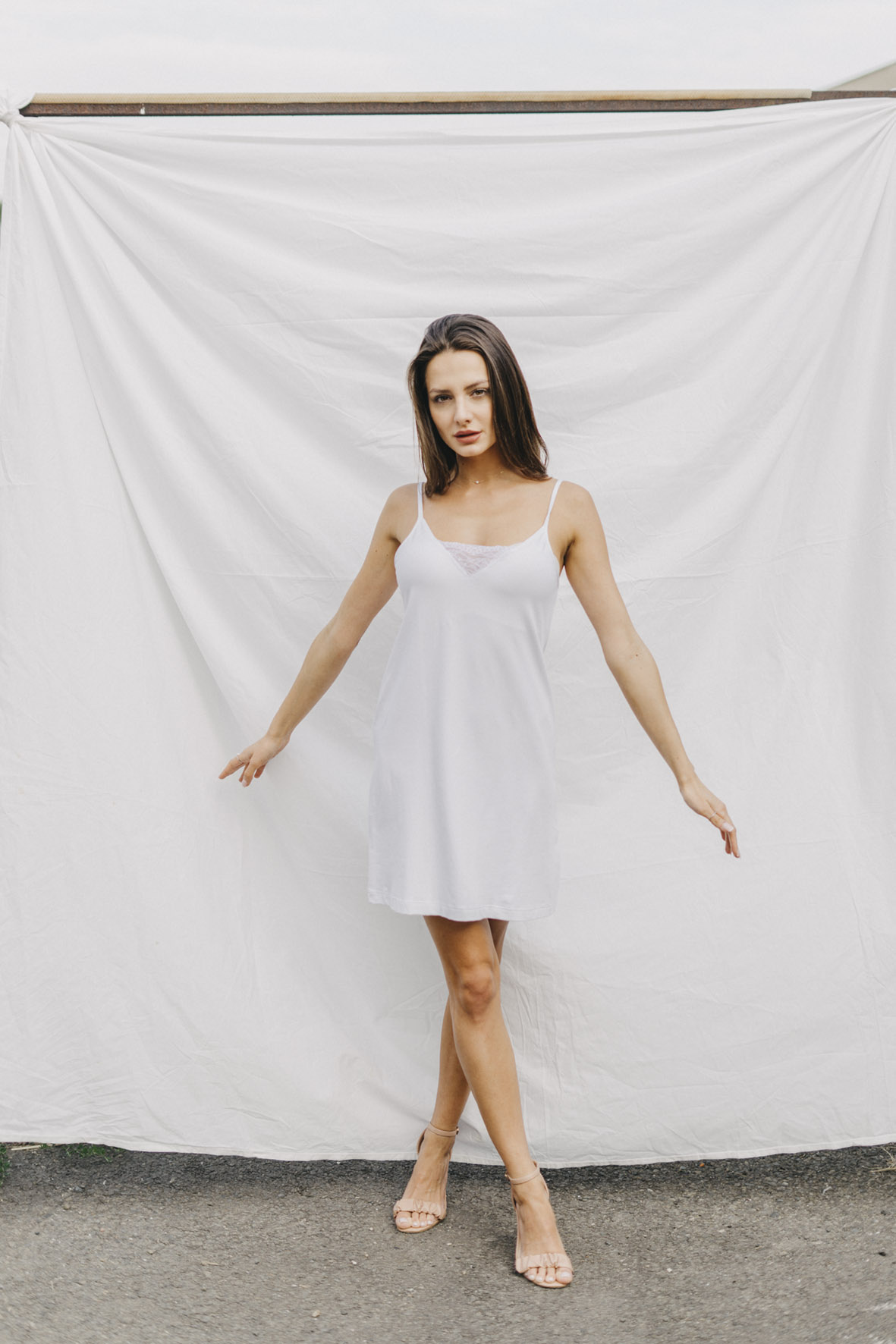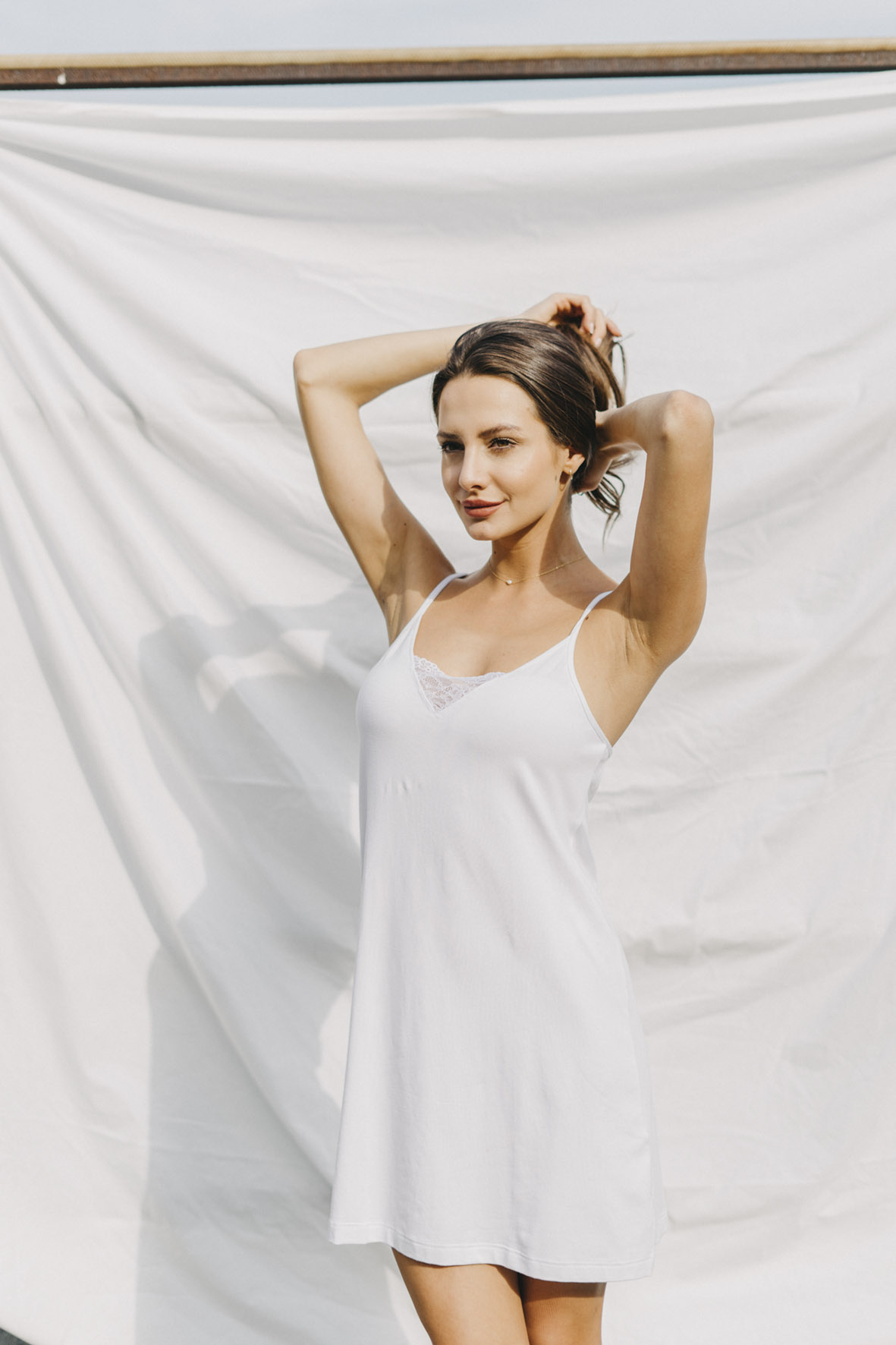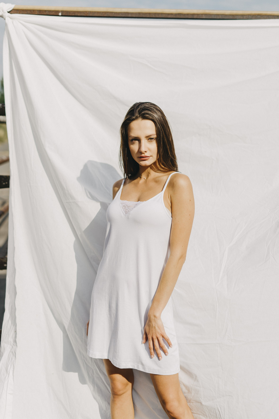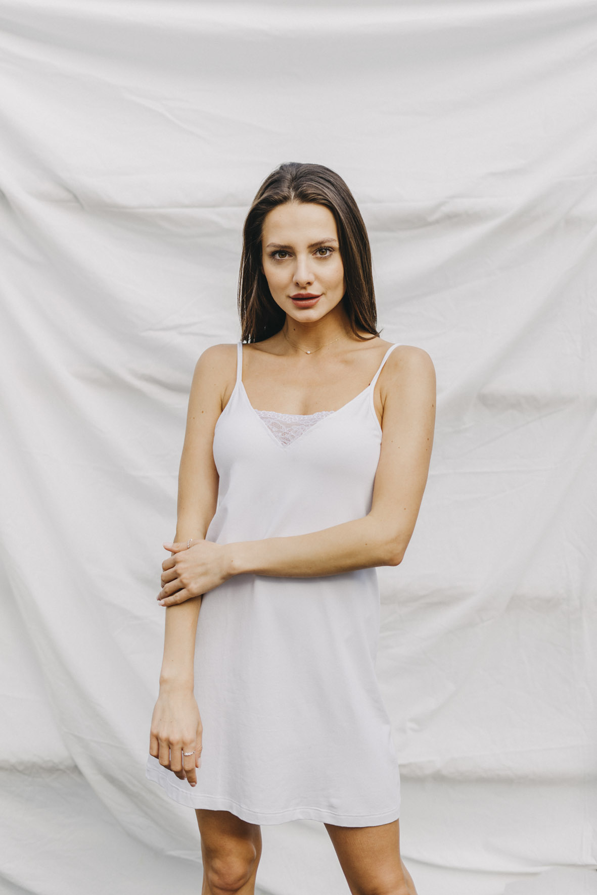 The Romantic nightgown with a V-neckline reaches approximately above the knees (depending on your height, we recommend following the size chart). Treat yourself to freedom – the stretchy fabric and well-designed cut with thin straps ensure that the pajamas don't pull, pinch, or squeeze anywhere. See for yourself.